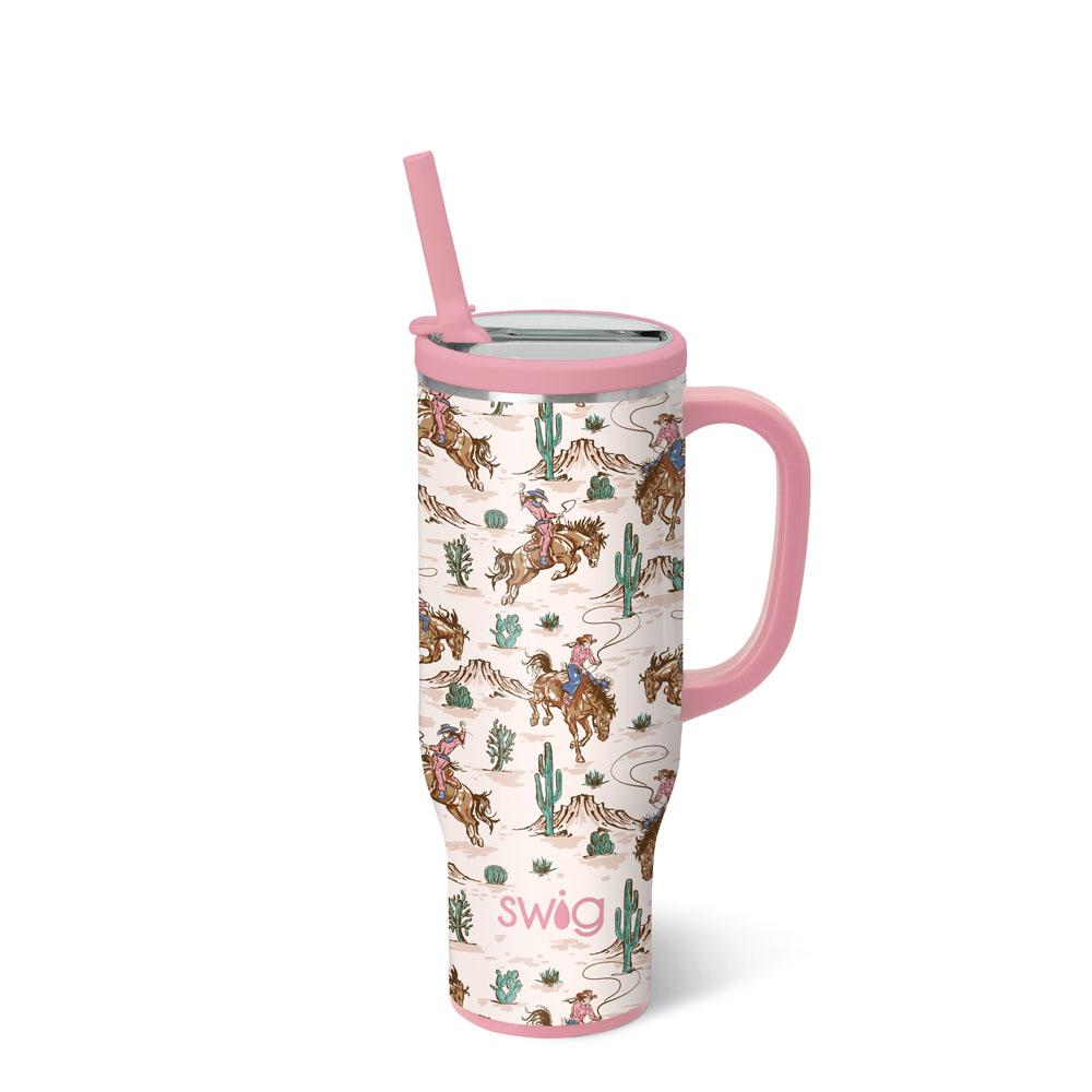 New lid, zero leaks, same great size! 🧊 Get rodeo ready with this illustrated design of cowgirls riding bucking broncos, with desert scenery on a glitter ivory background. 🐎