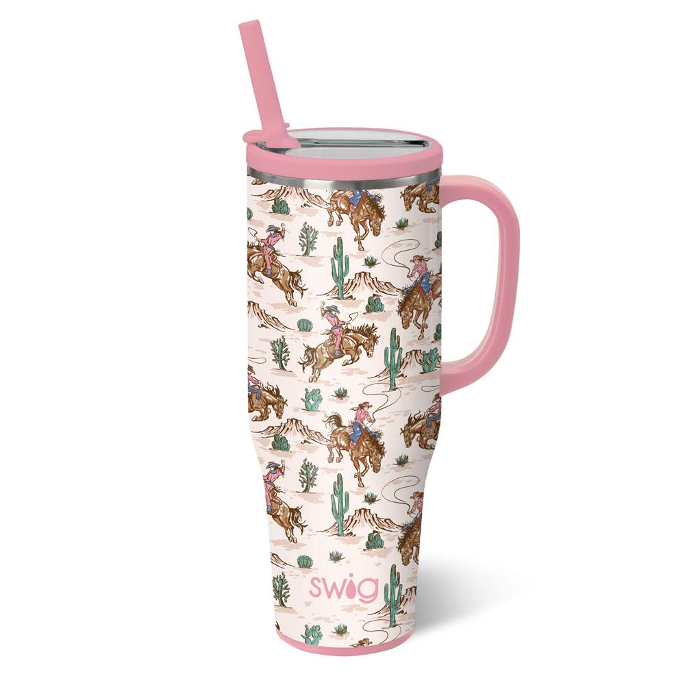 New lid, zero leaks, same great size! 🧊 Get rodeo ready with this illustrated design of cowgirls riding bucking broncos, with desert scenery on a glitter ivory background. 🐎