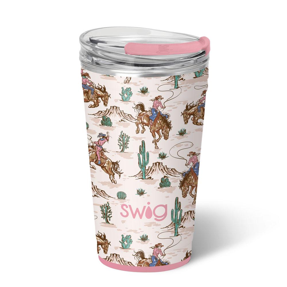 Party-Ready! 🥳🥤 Get rodeo ready with this illustrated design of cowgirls riding bucking broncos, with desert scenery on a glitter ivory background. 🐎