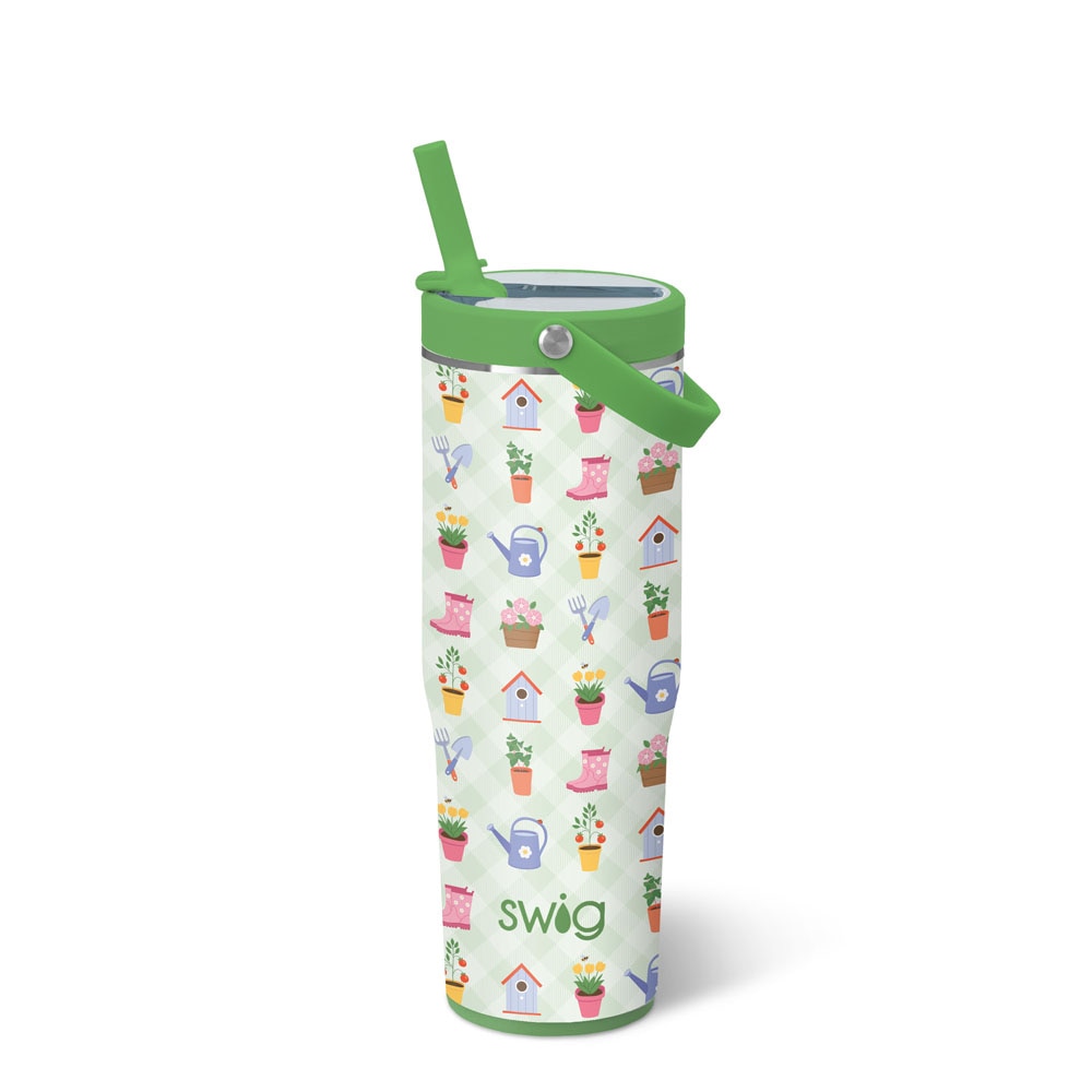 Hydrating made easy! 💧​This cheerful garden print grows to life with a patchwork of vibrant blooms, watering cans, and charming garden tools, across a soft green gingham backdrop. 🌿