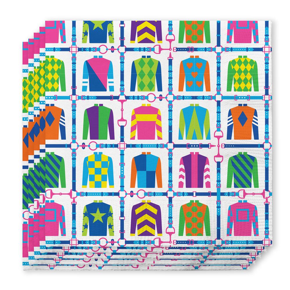 Elevate your celebration! 🎉 Place your bets, the jockeys are heading to the starting gate! 🏇 Celebrate Derby Day with this bright and colorful pattern of jockey silks and bridles on a white background.