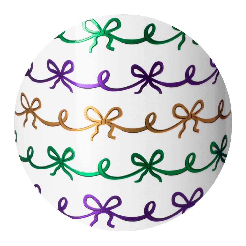 Bigger really is better! 💯 Bring on the bows, beads, and bourbon with this Mardi-ready print, featuring purple, green, and gold metallic bows on a glitter white background.