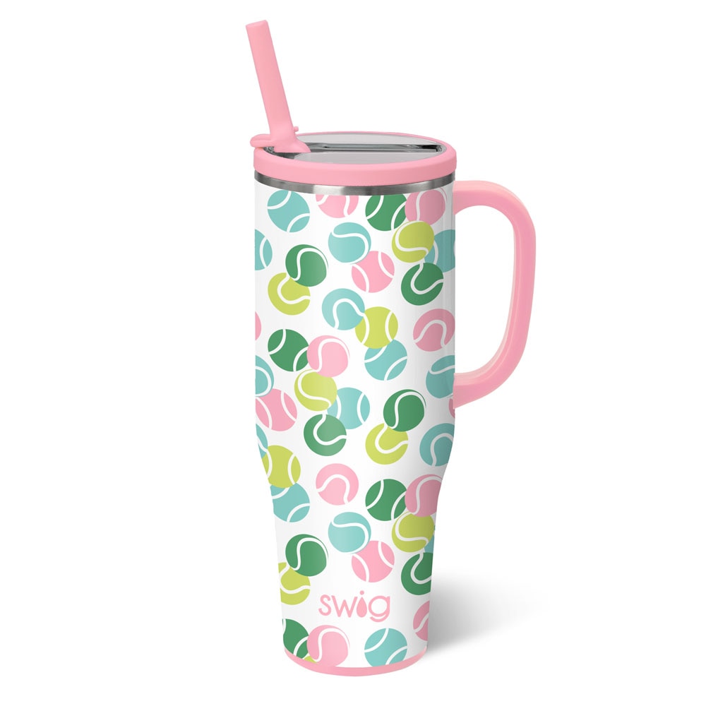 New lid, zero leaks, same great size! 🧊 Ace the court with these playful aqua, green and pink tennis balls on a glitter white background. 🎾