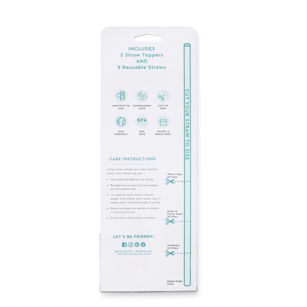 Compatible with all Swig tumblers and fits most other standard drinkware brands. Straws can be cut to size using the diagram featured on the back of the packaging. Pull gently when removing the protective cap to avoid damage.