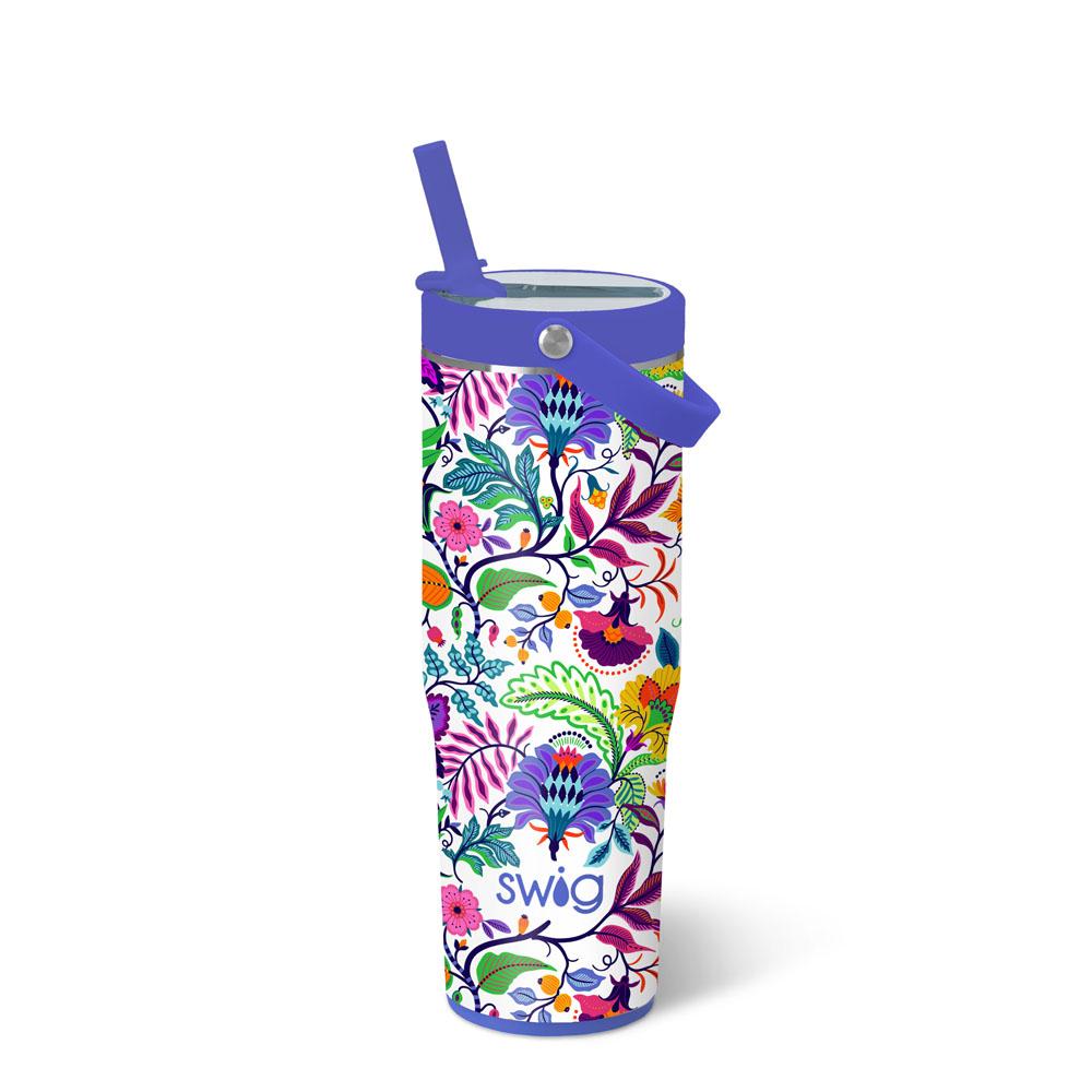 Hydrating made easy! 💧 This print bursts with vibrant energy and color, featuring a kaleidoscope of bold florals, leafy botanicals, and tangling vines on a glitter white background. 🌿