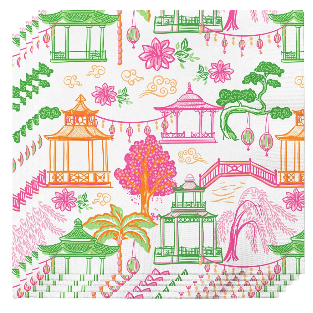 Elevate your celebration! 🎉 Transport yourself to paradise with this design of playful pagodas in pink, orange, and green, nestled among blooming floral motifs, lush greenery, and decorative trees on a white background. 🌺