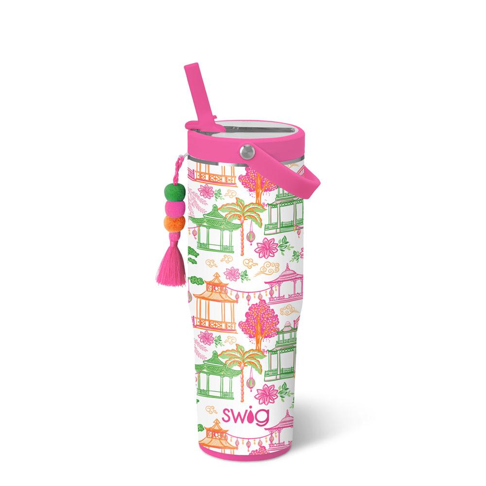 Hydrating made easy! ๐ง Transport yourself to paradise with this design of playful pagodas in pink, orange, and green, nestled among blooming floral motifs, lush greenery, and decorative trees on a glitter white background. ๐บ