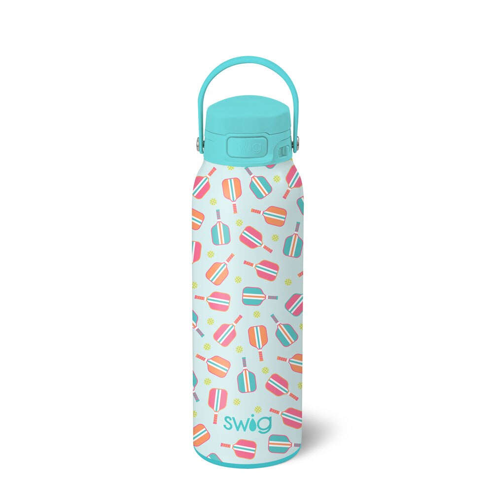 Hydrating made easy!💧 Serve game winning dinks with this playful aqua, pink, and coral paddle pattern on a glitter aqua background.