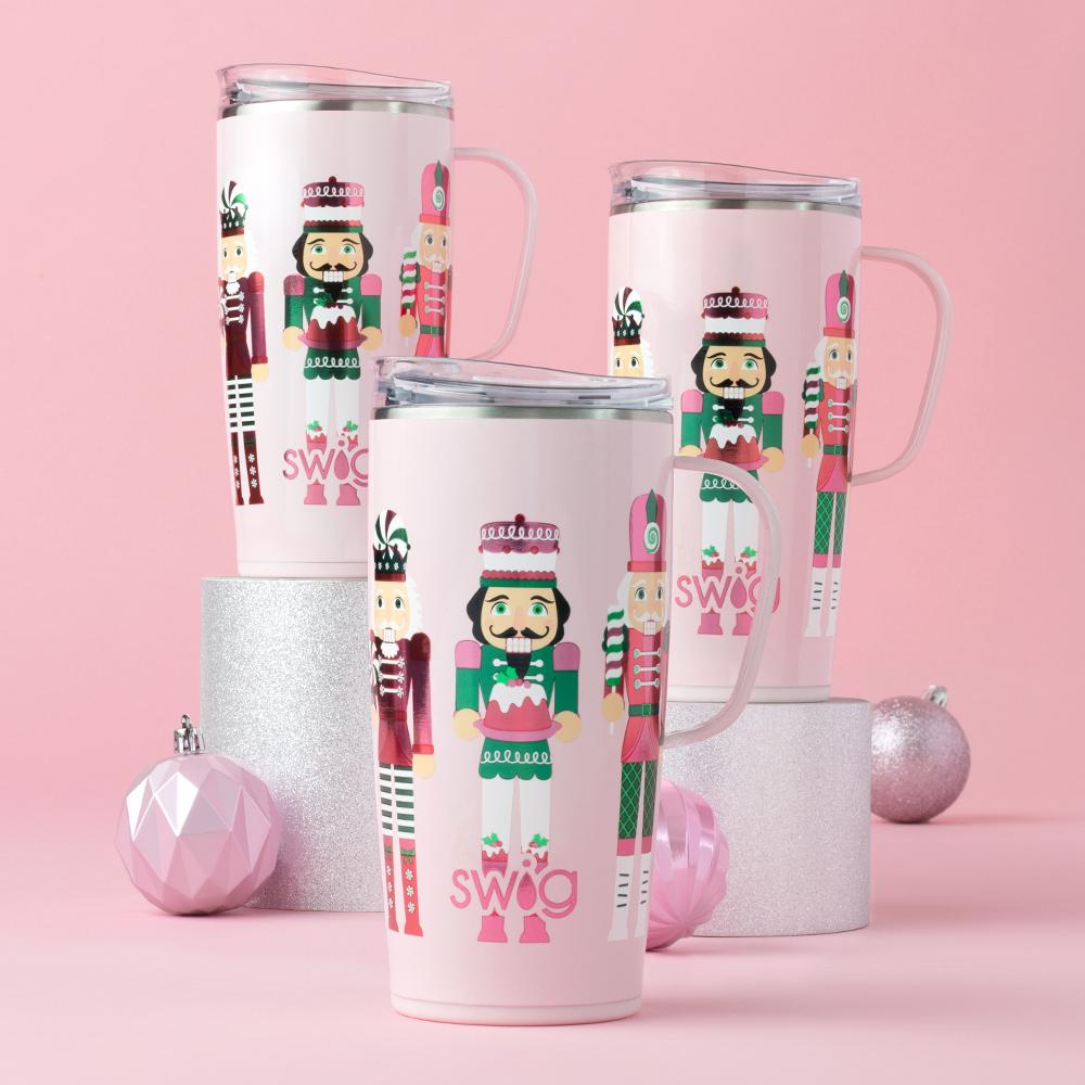 We've got it handled! ☕ Metallic toy soldiers dressed with peppermints and holiday candy march around a pale pink glitter background.