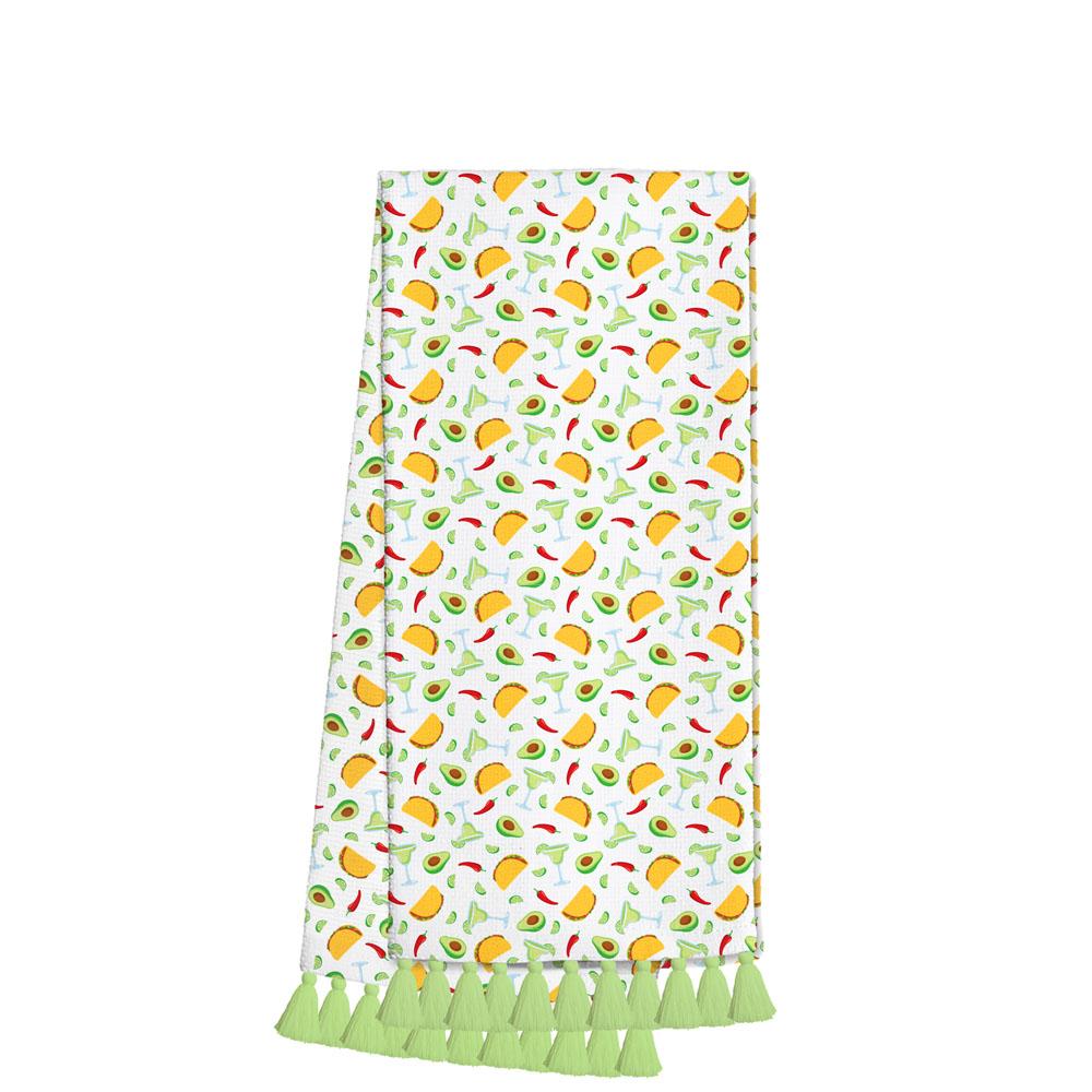 Give the perfect gift for any kitchen with this stylish tea towel! Taco about a perfect Swig! 🌮 Get Taco Night ready with this festive design of tacos, avocados, peppers and lime margaritas on a white background.